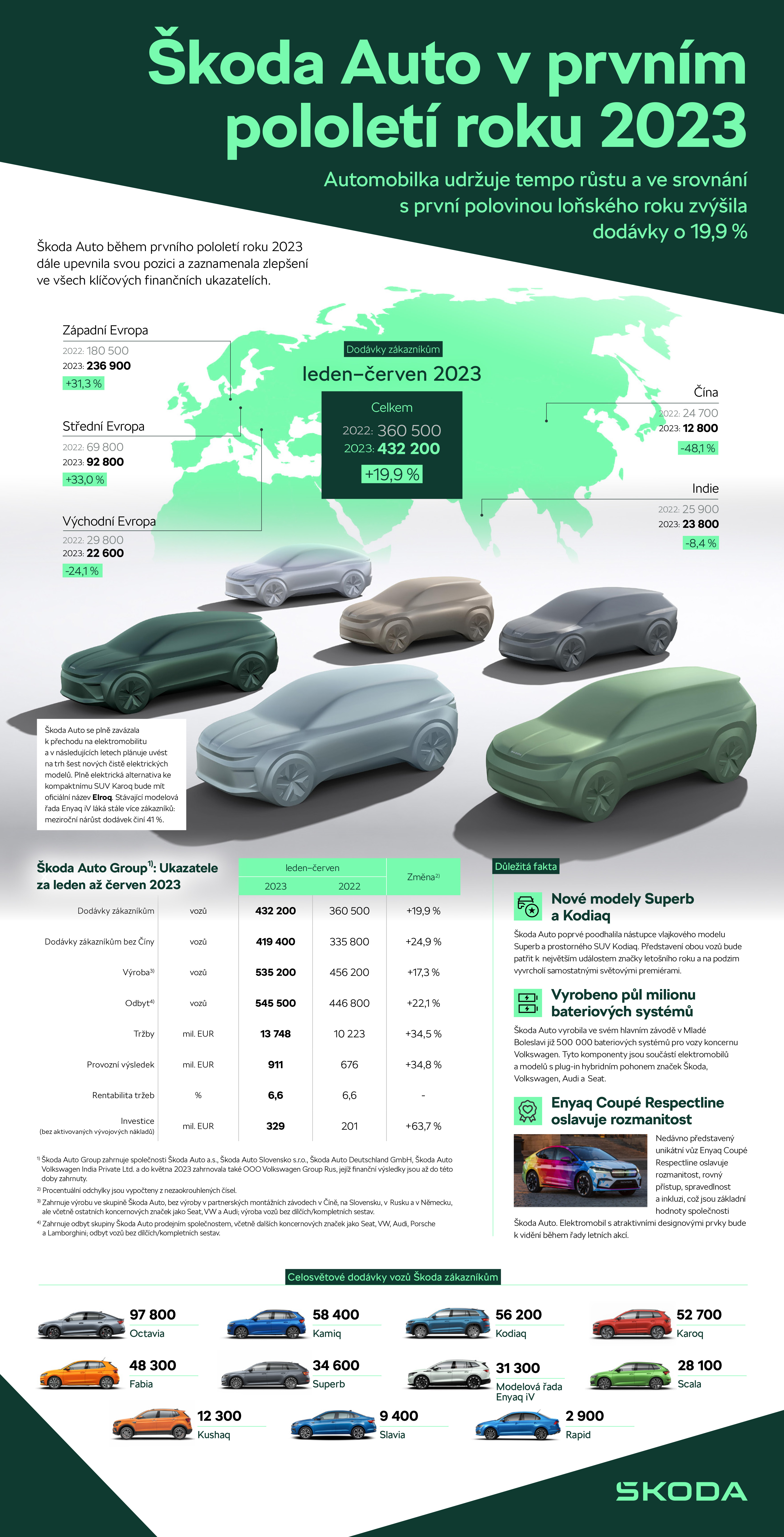 Škoda Auto během prvního pololetí roku 2023 dále upevnila svou pozici, a to i přes pokračující náročnou situaci na trhu. Provozní zisk celé skupiny Škoda Auto Group dosáhl 911 milionů eur, což představuje meziroční nárůst o 34,8 %. Rentabilita tržeb zůstává na stabilní hodnotě 6,6 %. Automobilka globálně dodala od ledna do června 432 200 vozů, tedy o 19,9 % více než ve stejném období loňského roku. Obzvláště silný nárůst zaznamenala značka u nejprodávanějšího modelu Octavia (+60,2 %) a plně elektrického modelu Enyaq iV (+41,0 %).