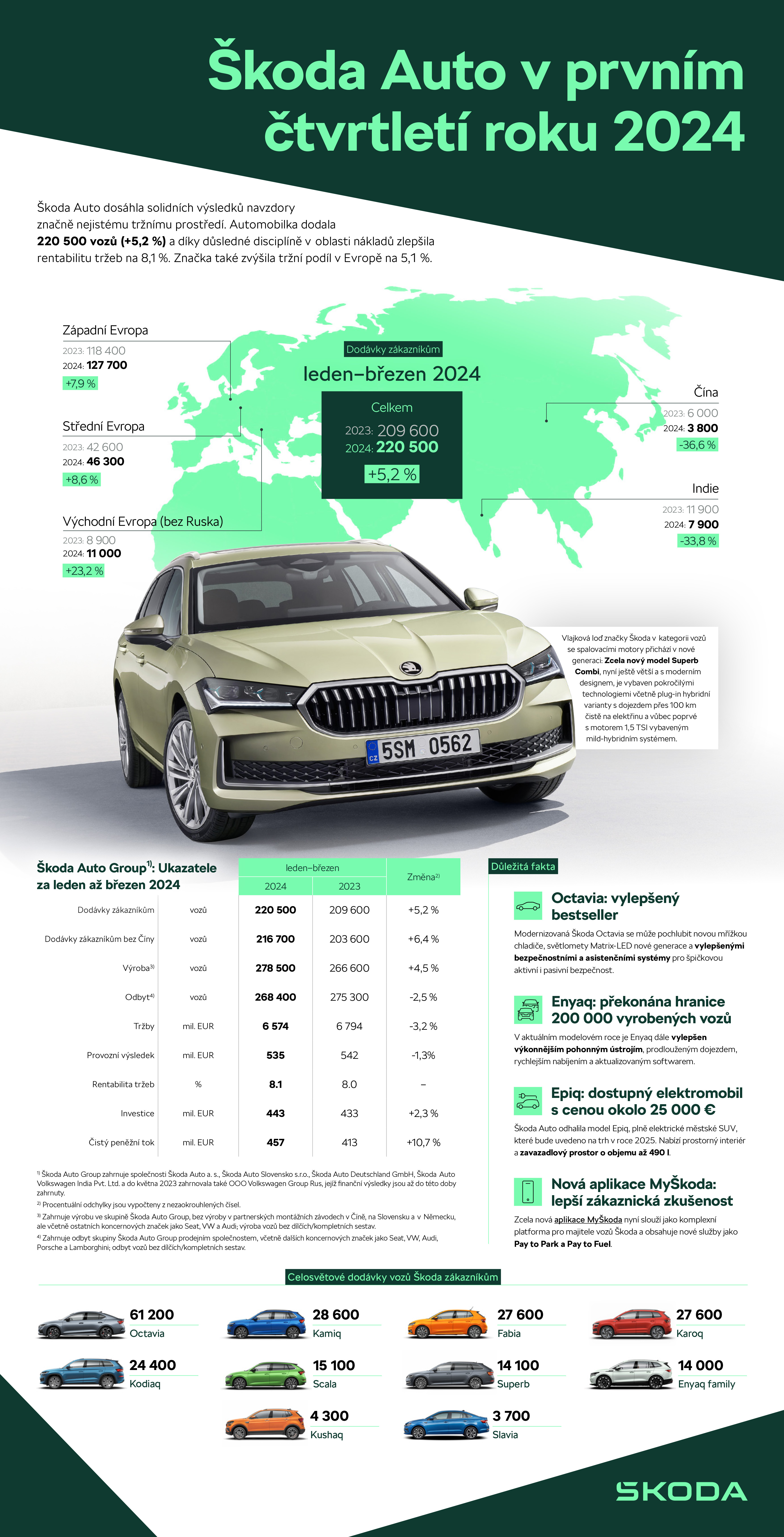 Škoda Auto Group1) – Klíčové hospodářské ukazatele za leden až březen 2024/20232)