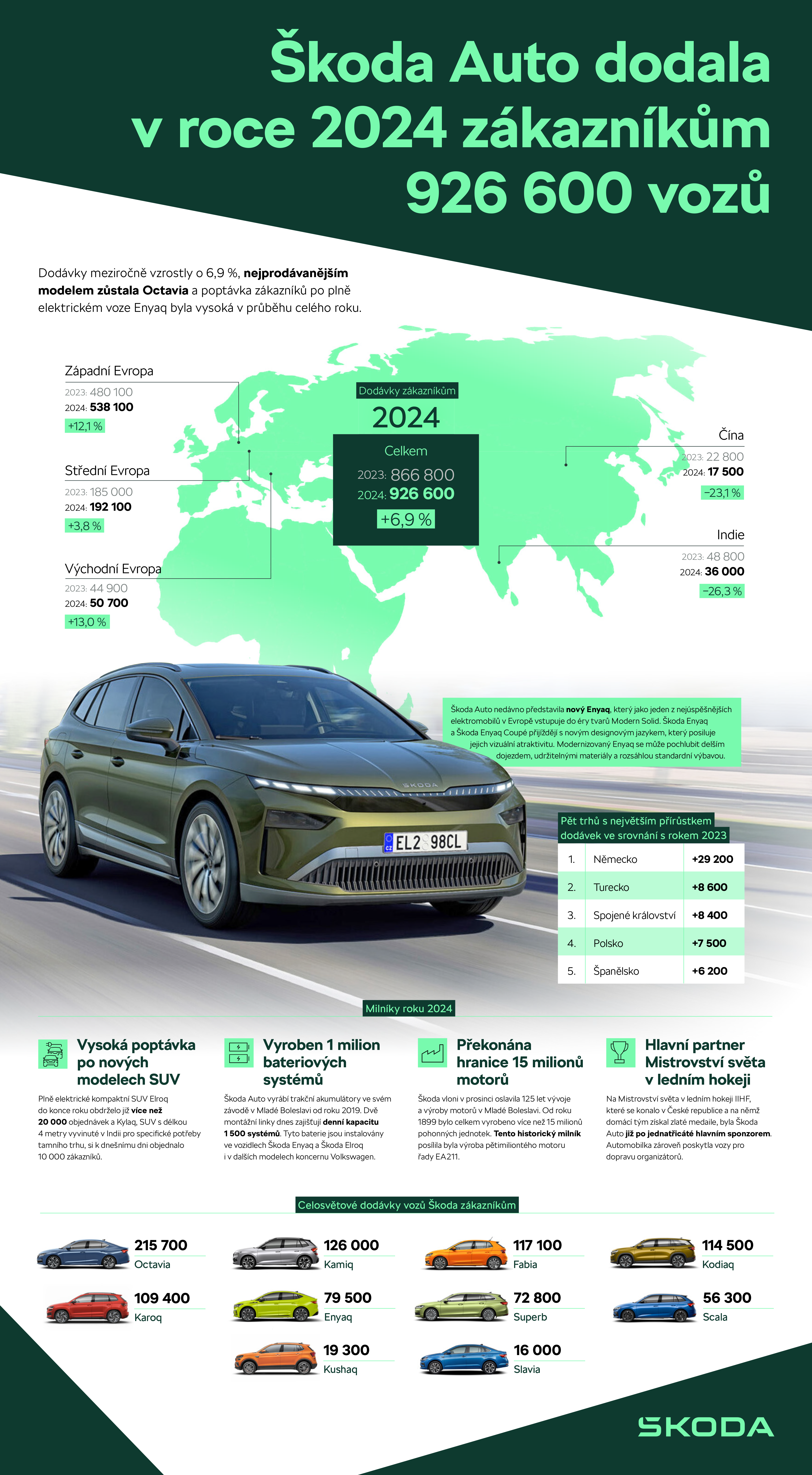 „V roce 2024 jsme dosáhli růstu 6,9 % po celém světě, především díky našemu početnějšímu a modernímu portfoliu. Obzvlášť dobře se nám dařilo na klíčových trzích v západní a východní Evropě. Když se podíváme na modelovou řadu, pozoruhodný nárůst přinesly zejména modernizovaná Octavia a Superb a Kodiaq nové generace. Rodina plně elektrických vozů Enyaq pokračovala ve svém úspěšném kurzu i v roce 2024 s téměř 80 000 dodávkami po celém světě a získala přední místa v registracích EV na několika evropských trzích. K tomu jsme do konce roku přijali více než 20 000 objednávek na nové elektrické kompaktní SUV Elroq. Navíc jsme usilovně pracovali na zlepšení zákaznického zážitku pro uživatele vozů Škoda zdokonalením aplikace MyŠkoda a rozšířením digitálních služeb, jako je Pay to Park a Pay to Fuel. Pokračovali jsme s modernizací našich showroomů podle nové korporátní identity a dosud prošlo proměnou přes 230 dealerství.“