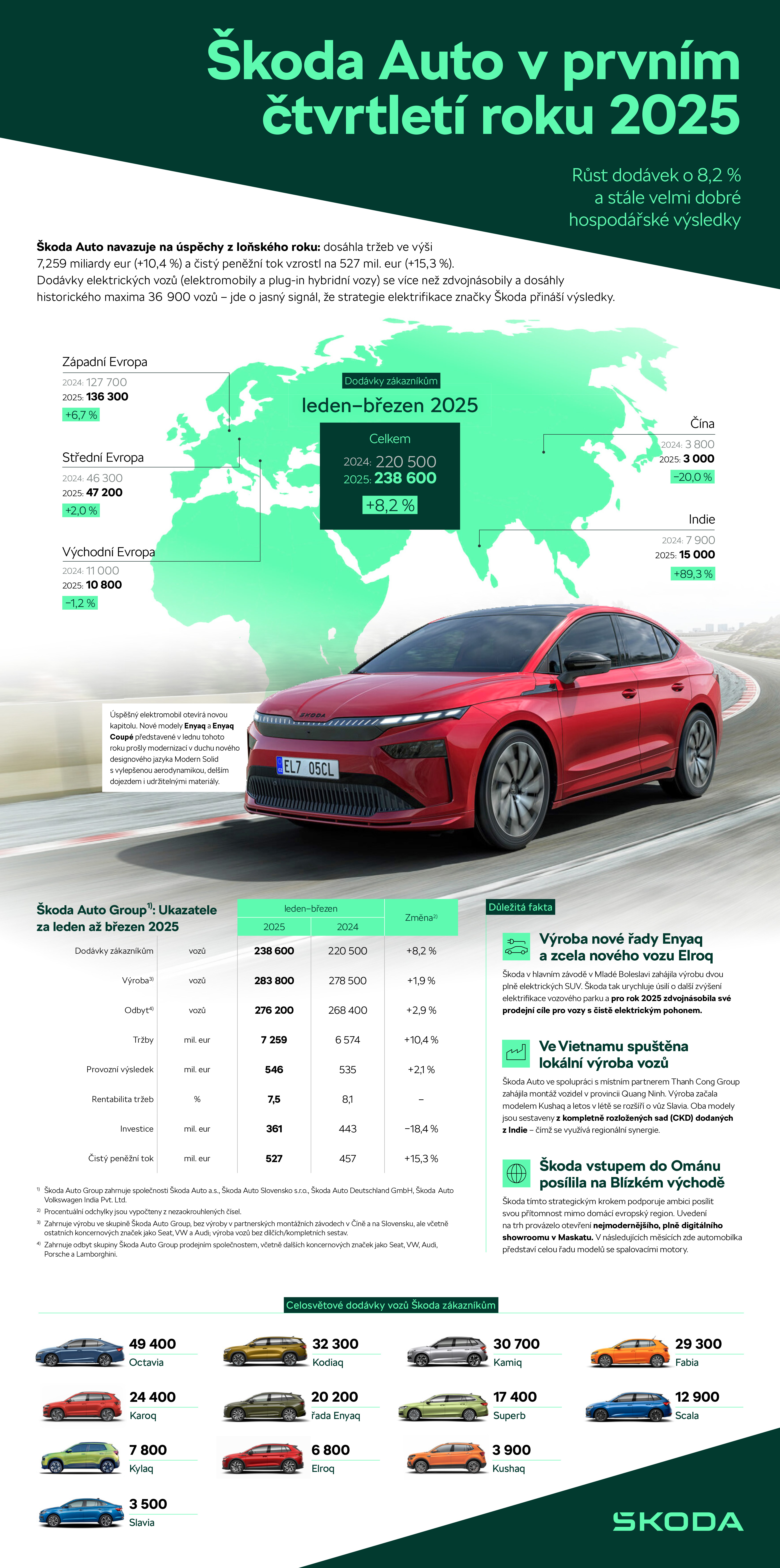 Škoda Auto zahájila rok 2025 v plné síle a od ledna do března dodala zákazníkům po celém světě 238 600 vozů, což představuje nárůst o 8,2 % ve srovnání se stejným obdobím loňského roku. Mezi trhy s nejlepšími výsledky patřily Německo (46 500 vozů; +6,7 %), Spojené království (22 600; +23,0 %), Česká republika (22 000; +8,6 %), Indie (15 000; +89,3 %) či Izrael (8 200; +35,8 %). Ke zvýšení dodávek přispěly významným růstem také Francie a Švédsko.