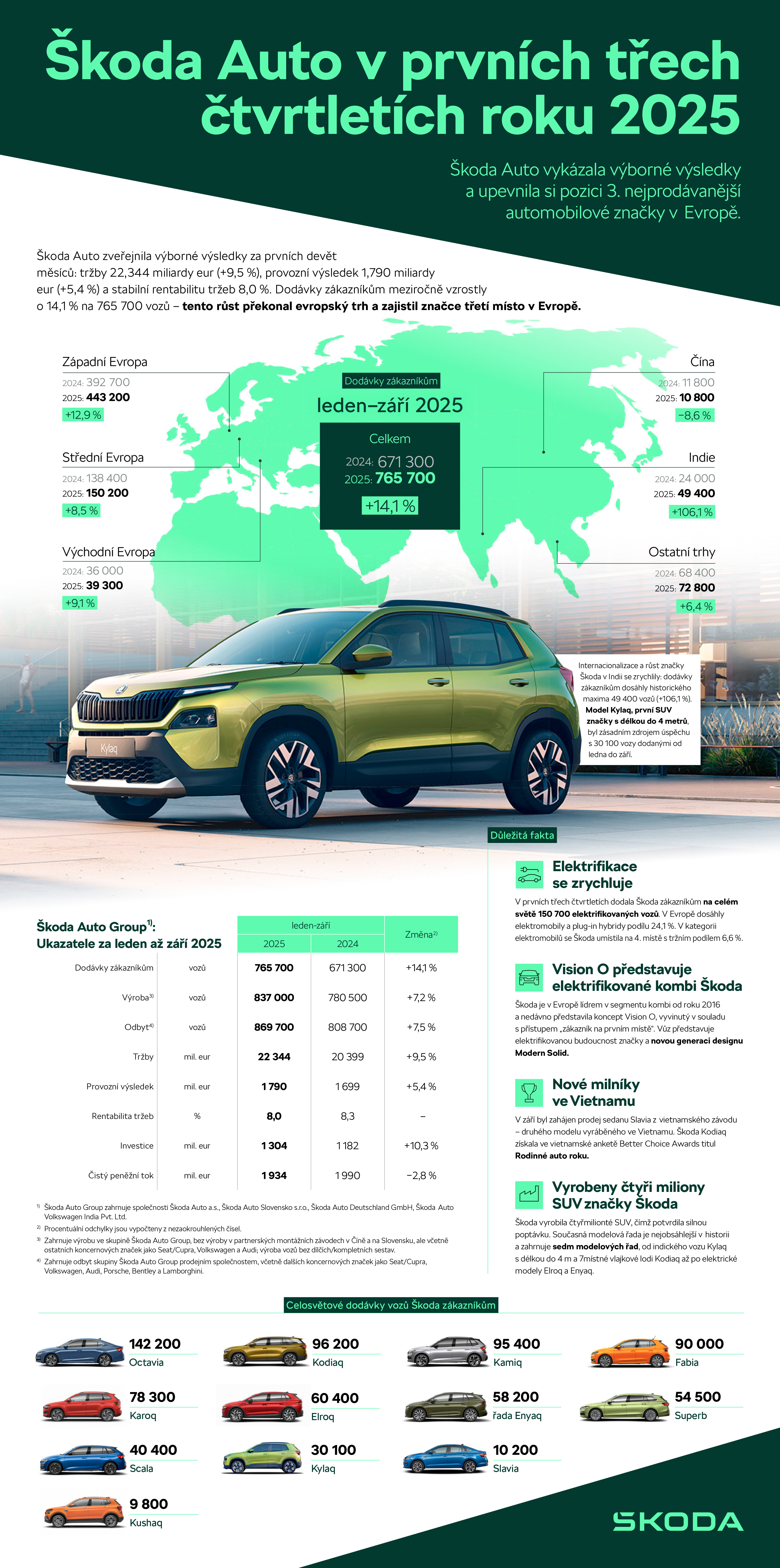 Škoda Auto Group1) – Klíčové hospodářské ukazatele za první tři čtvrtletí 20252)